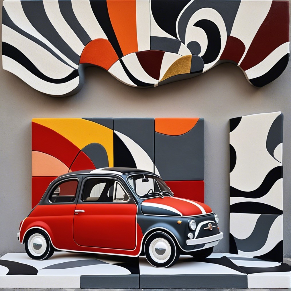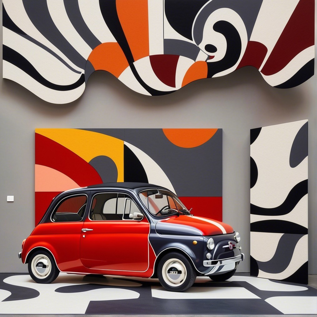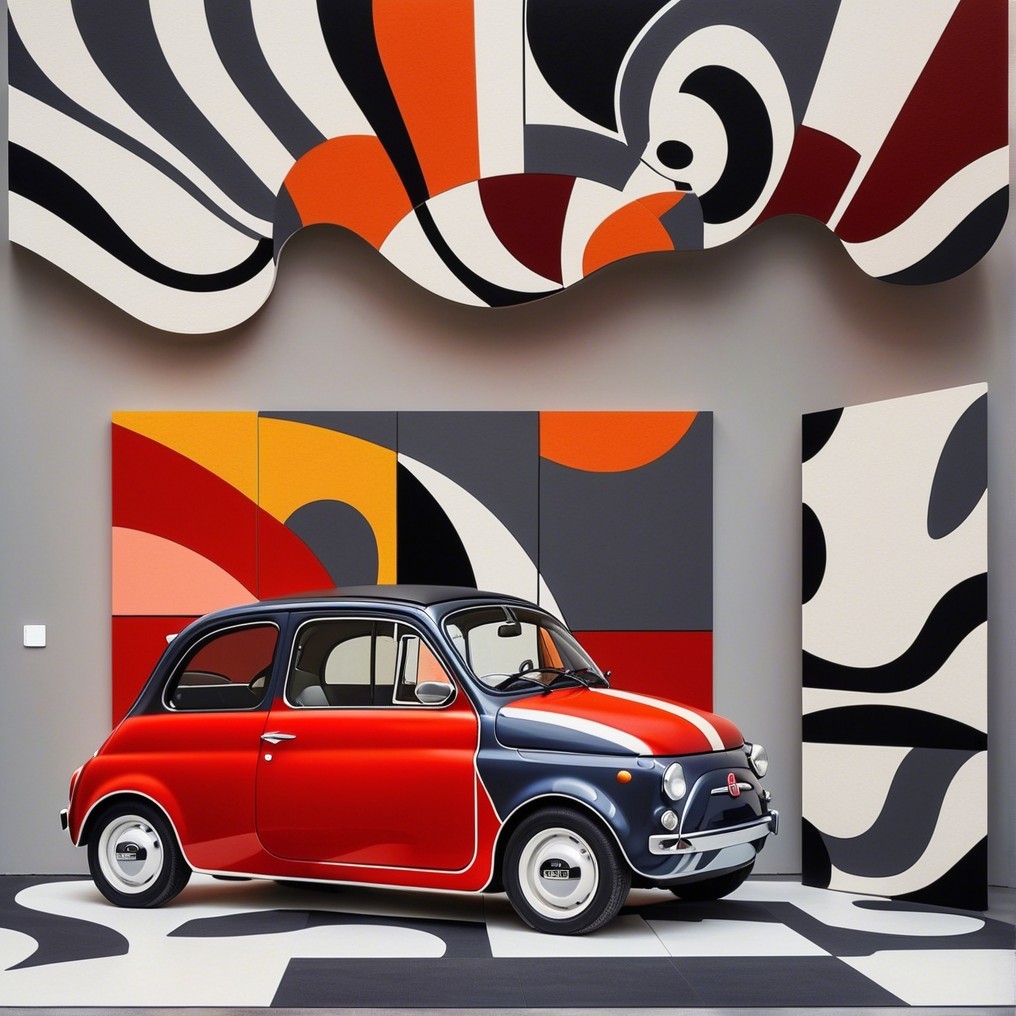 A Fiat 500 sits within a dreamlike gallery of swirling Op Art panels. The car’s red and navy contours echo the rhythm of the abstract backdrop. Bold forms, soft shadows, and luminous gradients craft a precise, serene celebration of Italian design and visual harmony.