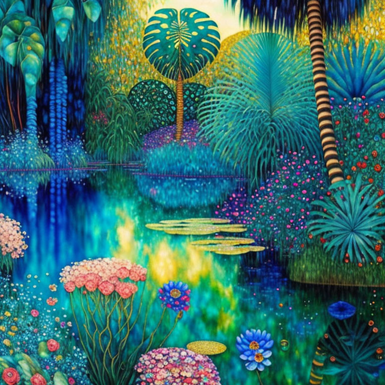 Prompt: Full page, single image, fantastic wide view, 3D watercolor patchwork, in the very best style of Gustav Klimt of an azure-colored pond reflecting a beautiful [Tingatinga style garden with tropical flowers in multiple vibrant spectacular colors, many palm trees, and plants with delicate leaves in shades of turquoise and teal and gold], golden sunrise rays shimmering over the scene, detailed intricate, satiny, high quality, elegant, highly detailed, glistening magic style with elements in the style of Jan Toorop
