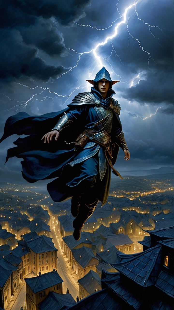 A heroic figure, an elf in dark robes, floats above a city under a stormy sky, with lightning illuminating the scene. The city’s rooftops glimmer below, enhancing the dramatic atmosphere.
