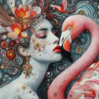 A striking portrait of a woman with intricate black and gold swirls in her hair, set against a textured background. Her expression is contemplative, blending modern art with classic beauty.