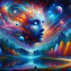 A vibrant, surreal landscape features swirling clouds and a celestial figure. Two figures stand by a river, surrounded by colorful trees, mountains, and an enchanting cosmic sky.