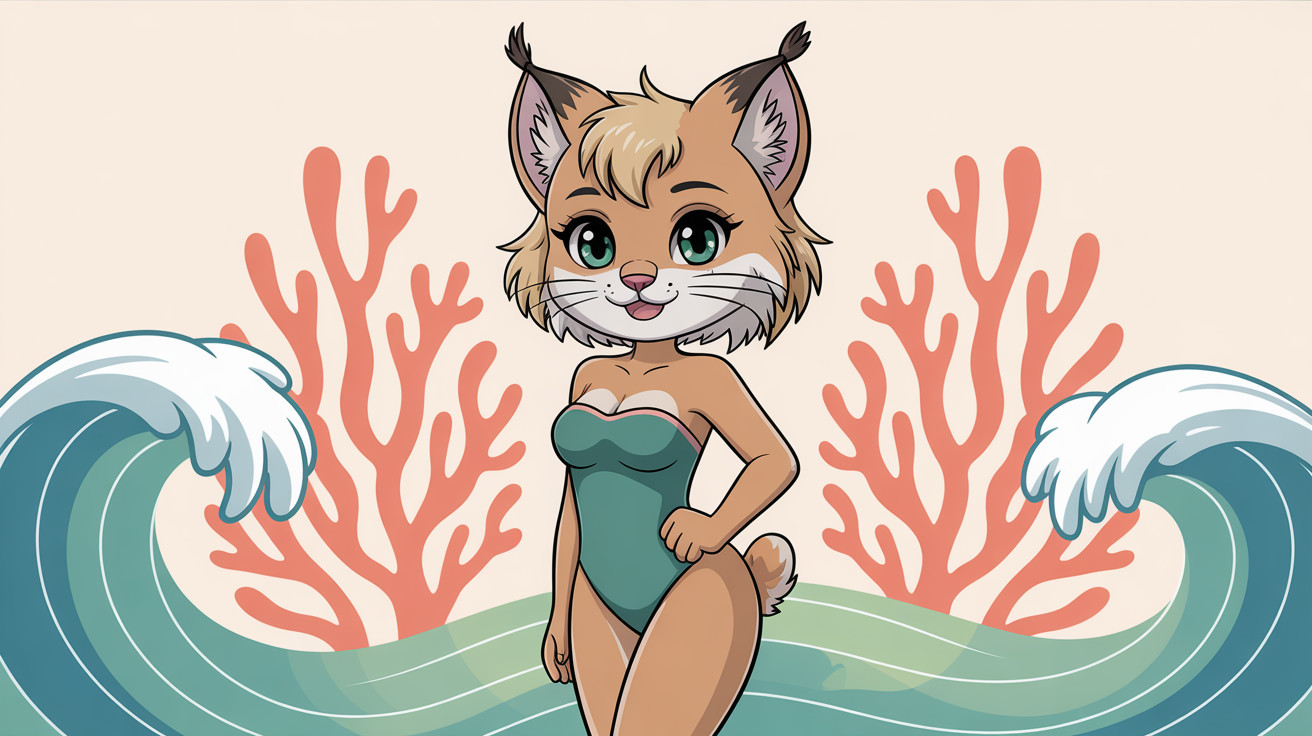 A charming character in a vibrant strapless swimsuit, featuring playful bobcat patterns. She exudes a fun, carefree vibe, with bright colors and a joyful expression, perfect for a summer day.