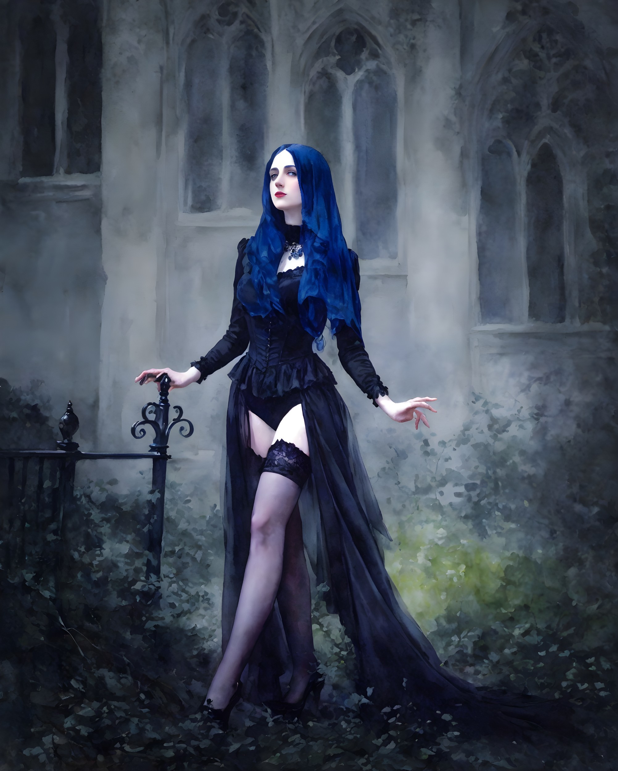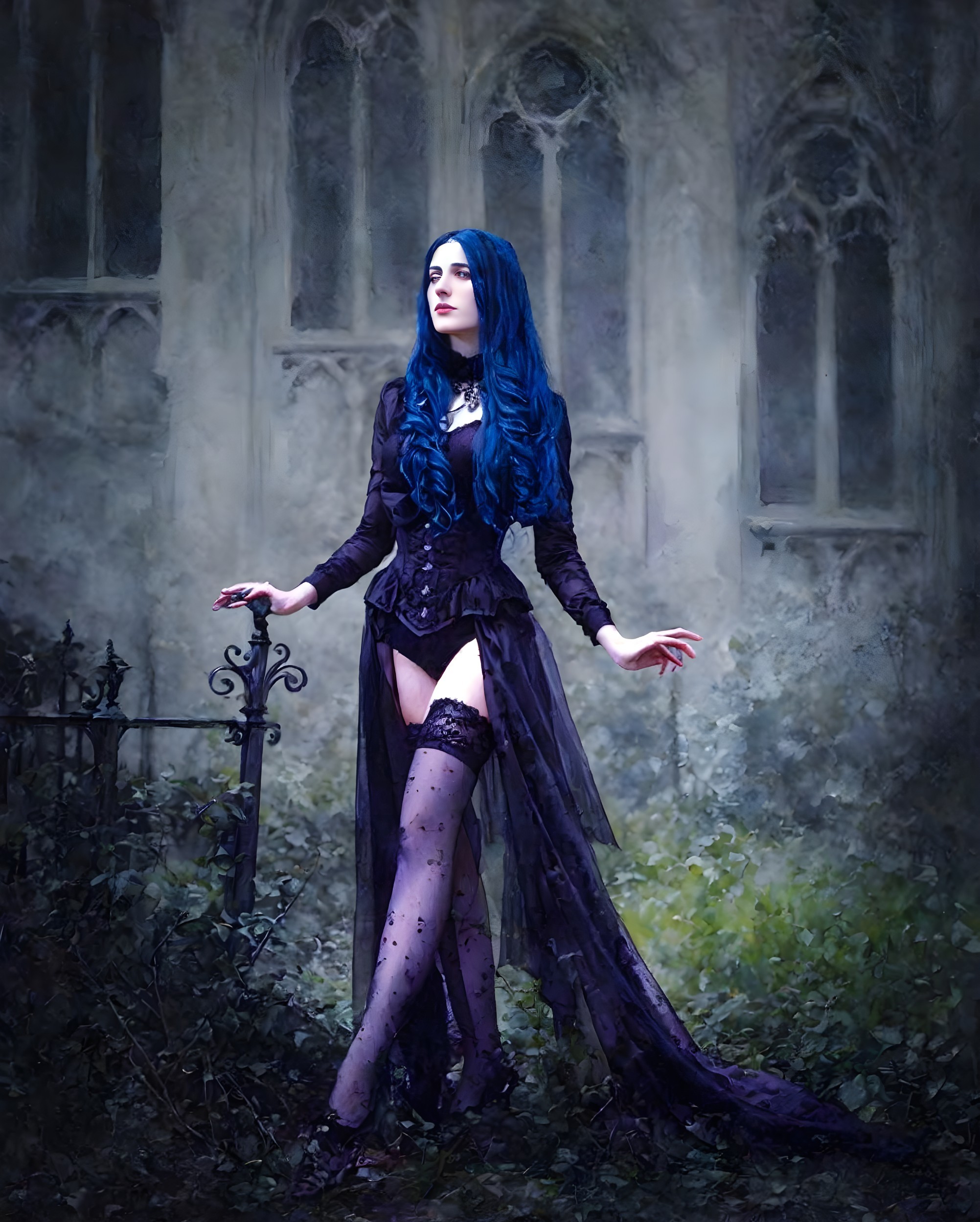 Woman with Blue Hair in Gothic Outfit by Cathedral