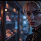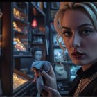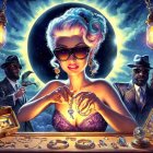 A glamorous woman in elegant attire examines a sparkling gemstone in a sophisticated jewelry shop, surrounded by displays of shimmering treasures and warm ambient lighting.