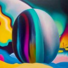 A vibrant, abstract composition features a spherical structure with intricate perforations, entwined in flowing, colorful ribbons. The background showcases a blend of vivid hues and orbs, creating a dynamic scene.