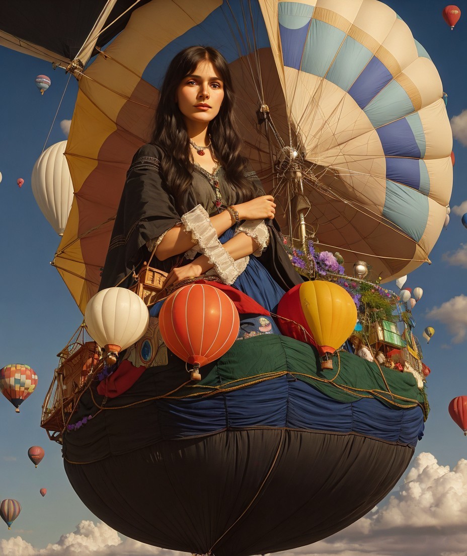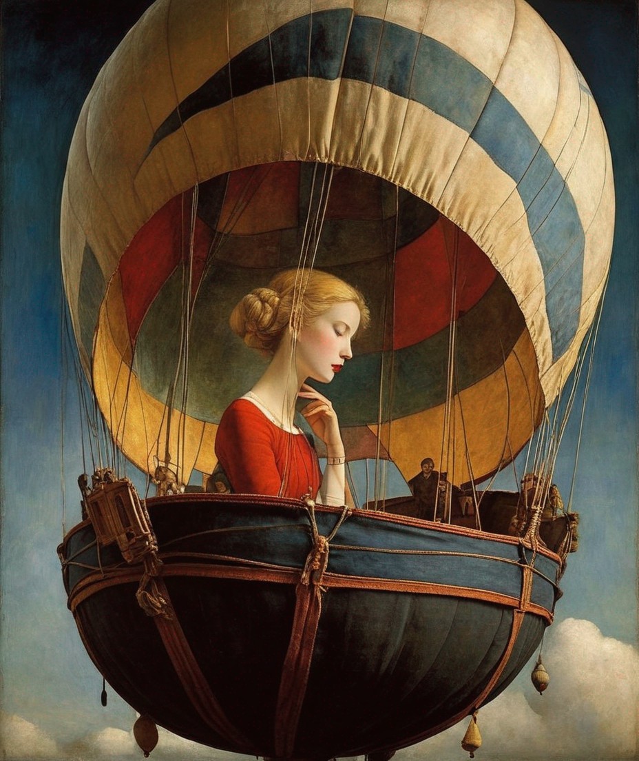 A vintage-style painting of people in a large hot air balloon with multiple smaller balloons in the background, all set against a blue sky.
