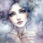 A delicate watercolor portrait of a young woman adorned with flowers in her hair, surrounded by soft pastel blooms and dreamy, abstract colors, exuding a magical and ethereal quality.