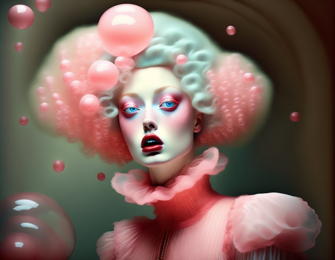 A striking, surreal portrait featuring a model with vibrant pink and teal hues, dramatic makeup, and an extravagant hairstyle, surrounded by glossy pink spheres and a colorful, abstract background.