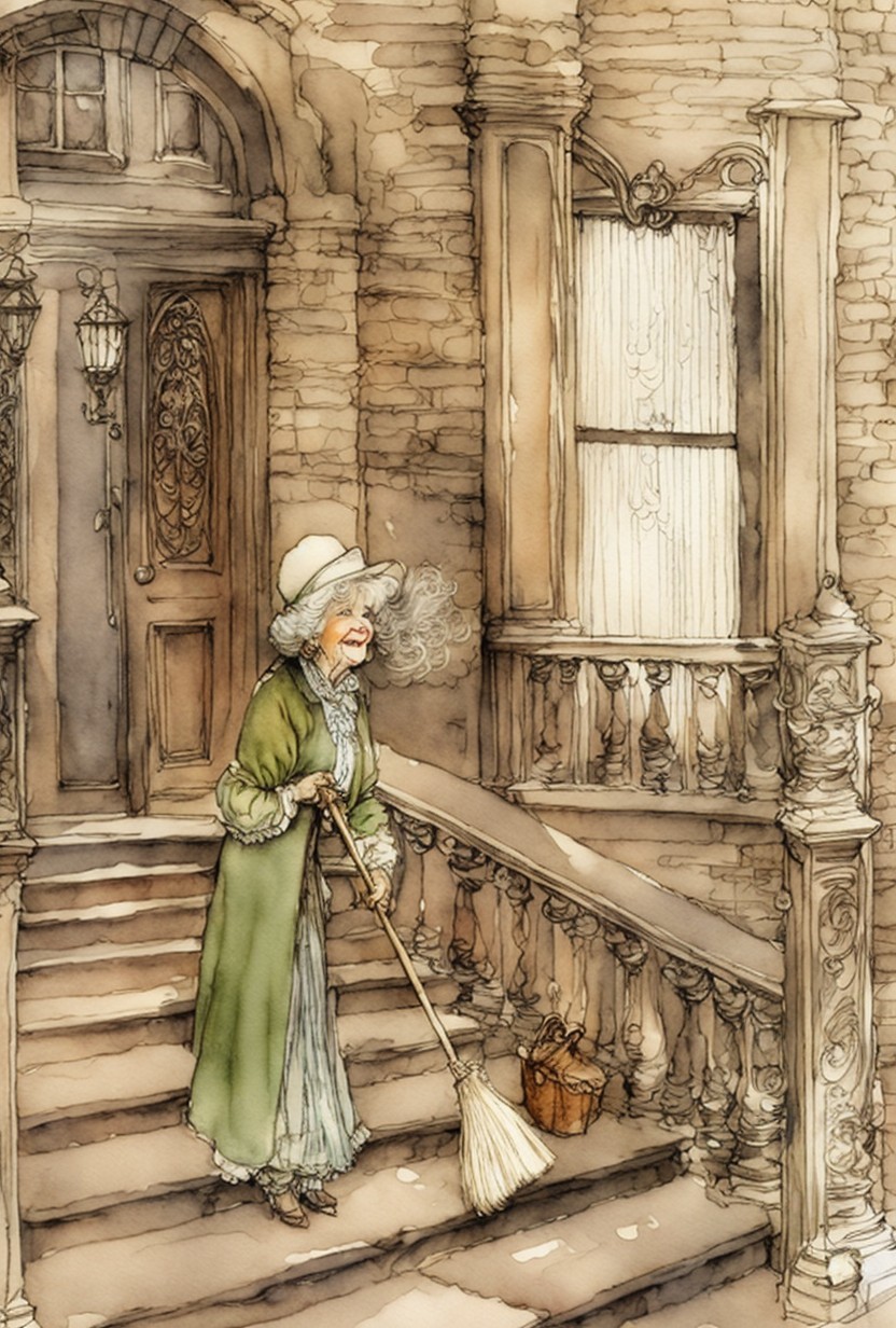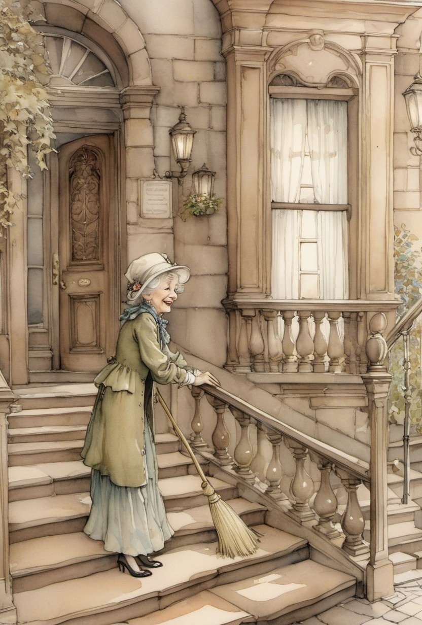 A cheerful elderly woman sweeps the elegantly designed staircase of a vintage building, adorned with warm lighting and intricate railings, filled with a cozy, nostalgic atmosphere.
