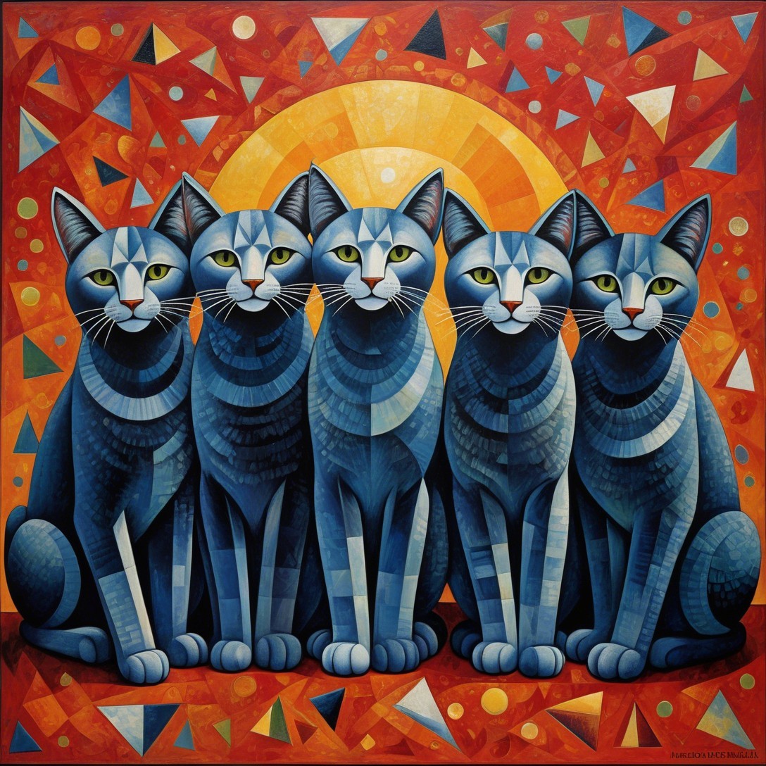 This vibrant artwork features five stylized blue cats lined up against a bright orange background, adorned with colorful geometric shapes and hearts, radiating warmth and playfulness.
