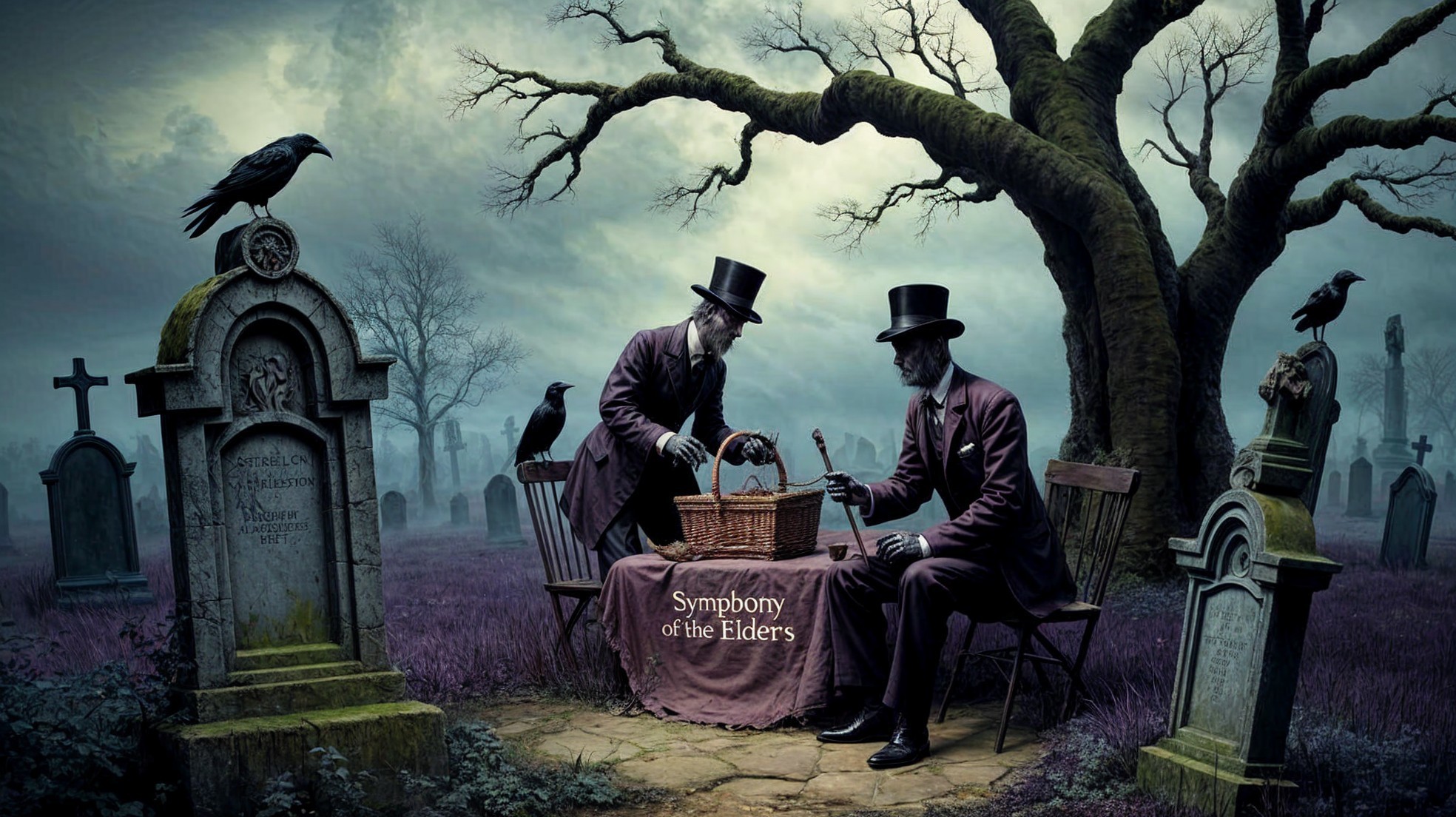 In a foggy graveyard, two figures dressed in dark clothing sit across from each other by a picnic basket. Crows circle above, enhancing the eerie, solemn atmosphere.