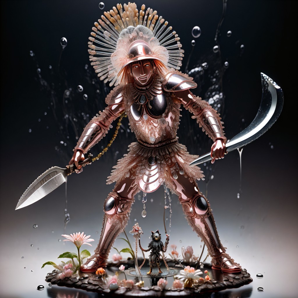 A fierce warrior stands ready for battle, clad in ornate, spiked armor and wielding a curved sword. His determined expression and detailed metalwork convey strength and valor.