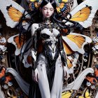 A fantasy-themed character with butterfly wings, dressed in a sleek, metallic outfit adorned with jewels. The backdrop features a mystical landscape, enhancing her ethereal appearance.