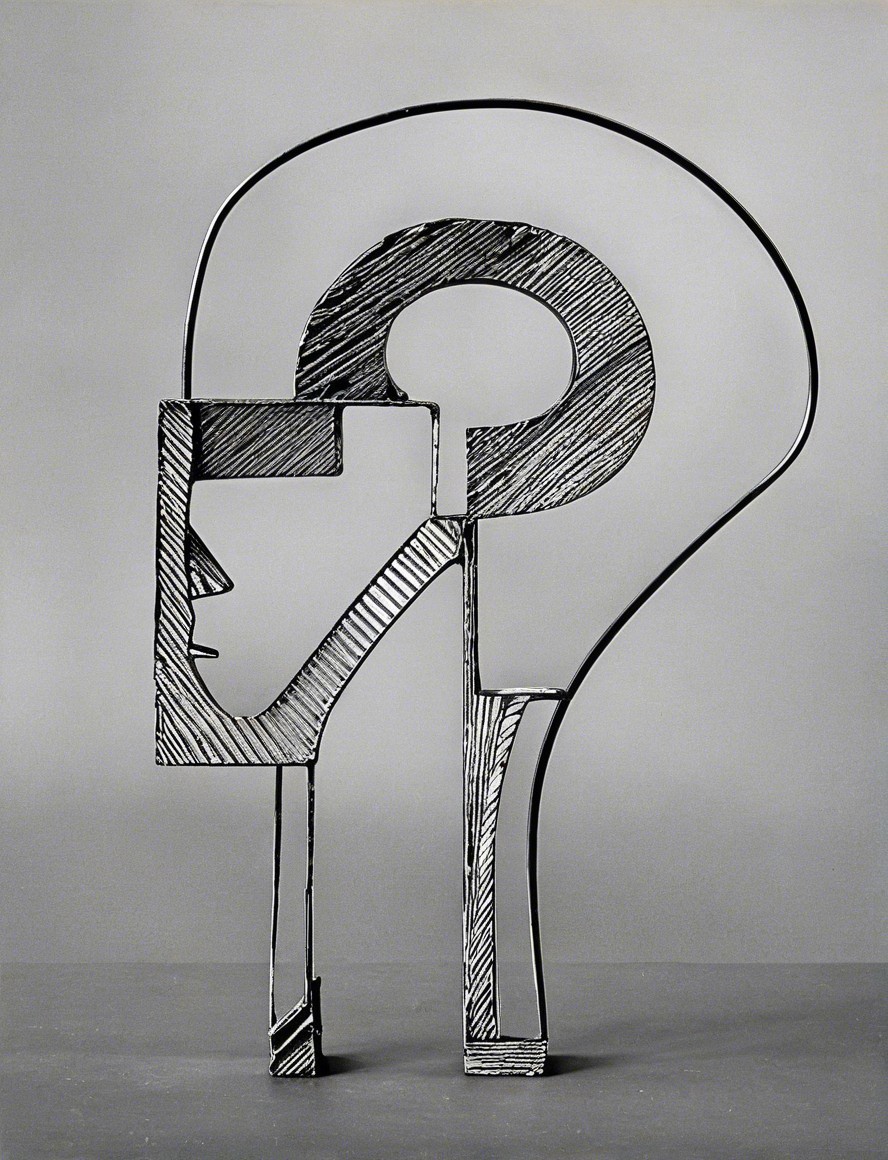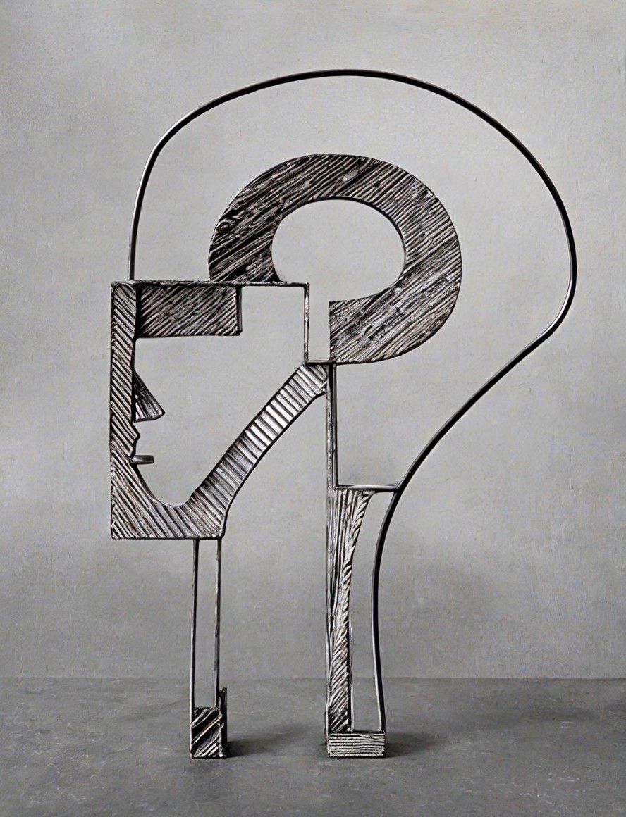 The image features an abstract metal sculpture depicting a stylized human face and head, with geometric shapes and lines creating a unique, modern design. The sculpture is set against a plain background.