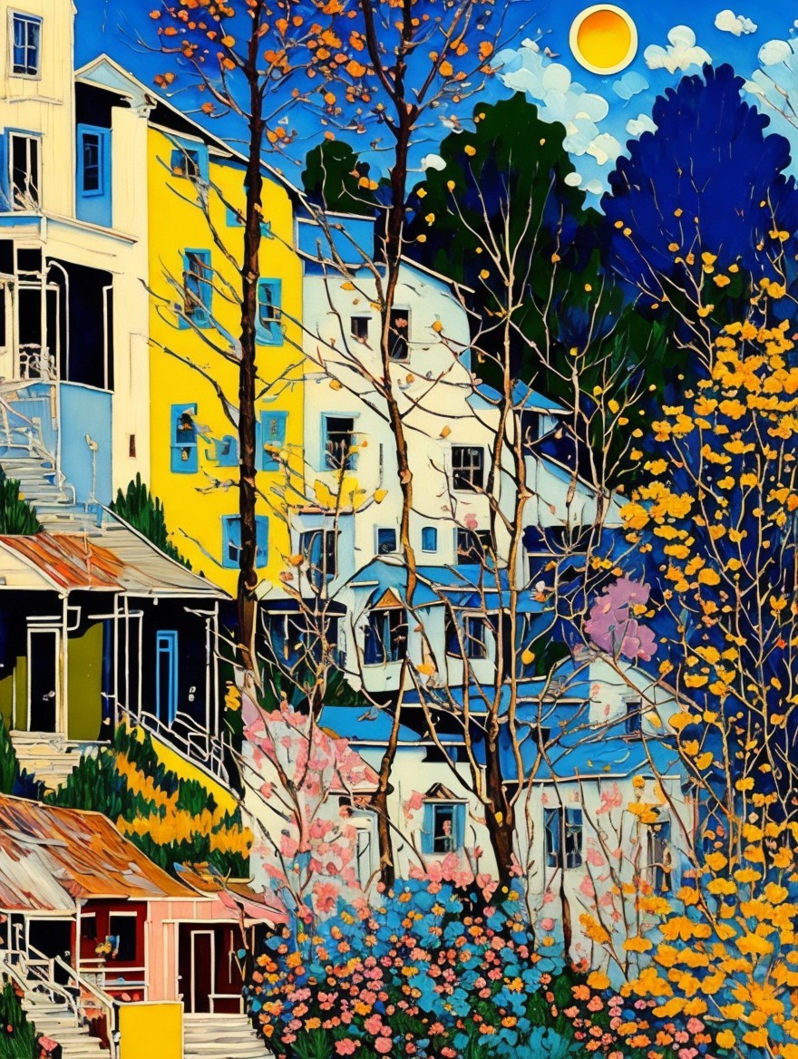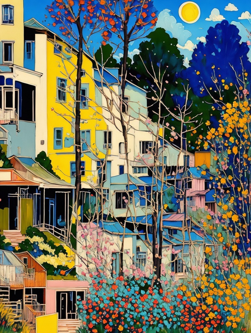 Lovely neighborhood Art by Alexandre Benois, Lynda Barry, Alejandro Burdisio, Guy Buffet, Richard Neutra, Mark Bradford, van Gogh, Justin Gaffrey, Maud Lewis, Gustave De Smet, John Lowrie Morrison, John Ruskin, Chris Friel, Valerie Hegarty, endre penovac. 3d, soft colors watercolors and ink, beautiful, fantastic view, extremely detailed, intricate, best quality, highest definition, rich colours