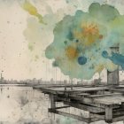 A man on a bicycle pauses by a tranquil wetland, gazing at elegant cranes. Above, a dramatic cloud looms, hinting at impending rain, blending surreal colors into the moody sky.