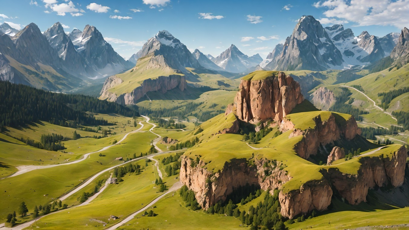 Majestic mountain peaks, lush meadows, and winding river landscape