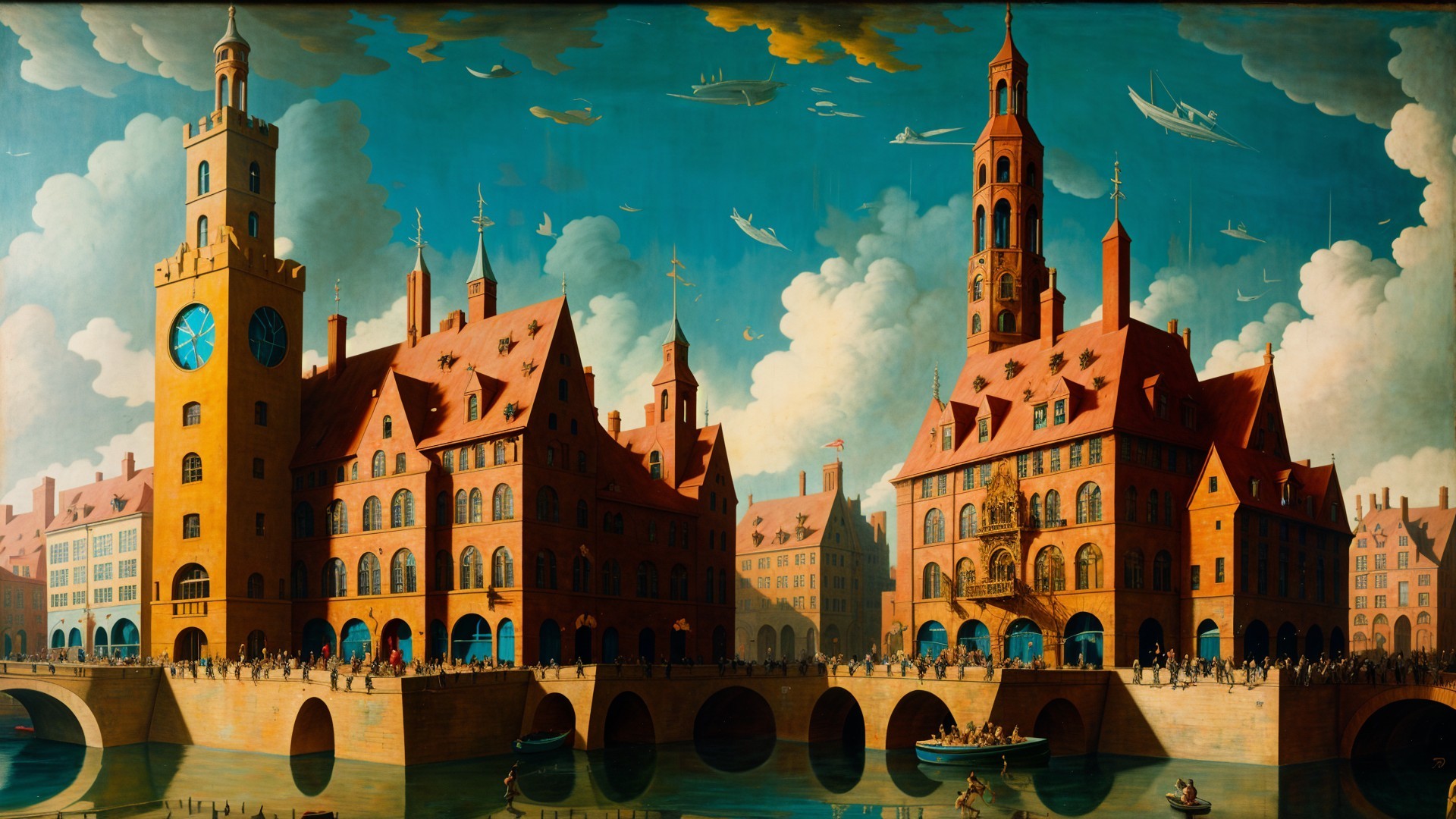 A whimsical, vibrant cityscape depicts charming medieval-style buildings with red roofs and arches over a serene river, featuring boats and fantastical flying creatures in a bright blue sky.