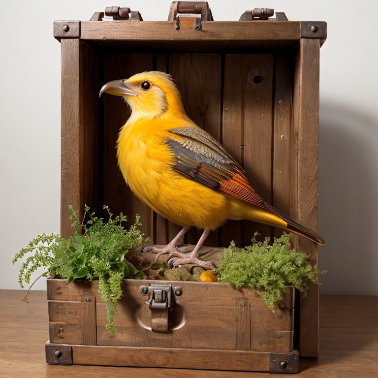 Explore a unique art style inspired by whimsical creatures resembling a yellow-orange beer crate, captured in stunning detail with a Nikon D850 camera. The artwork combines elements of high-definition 4K 3D technology, ceramics, and influences from renowned artists like John James Audubon and Maurits Cornelis Escher, all under the hashtag #193