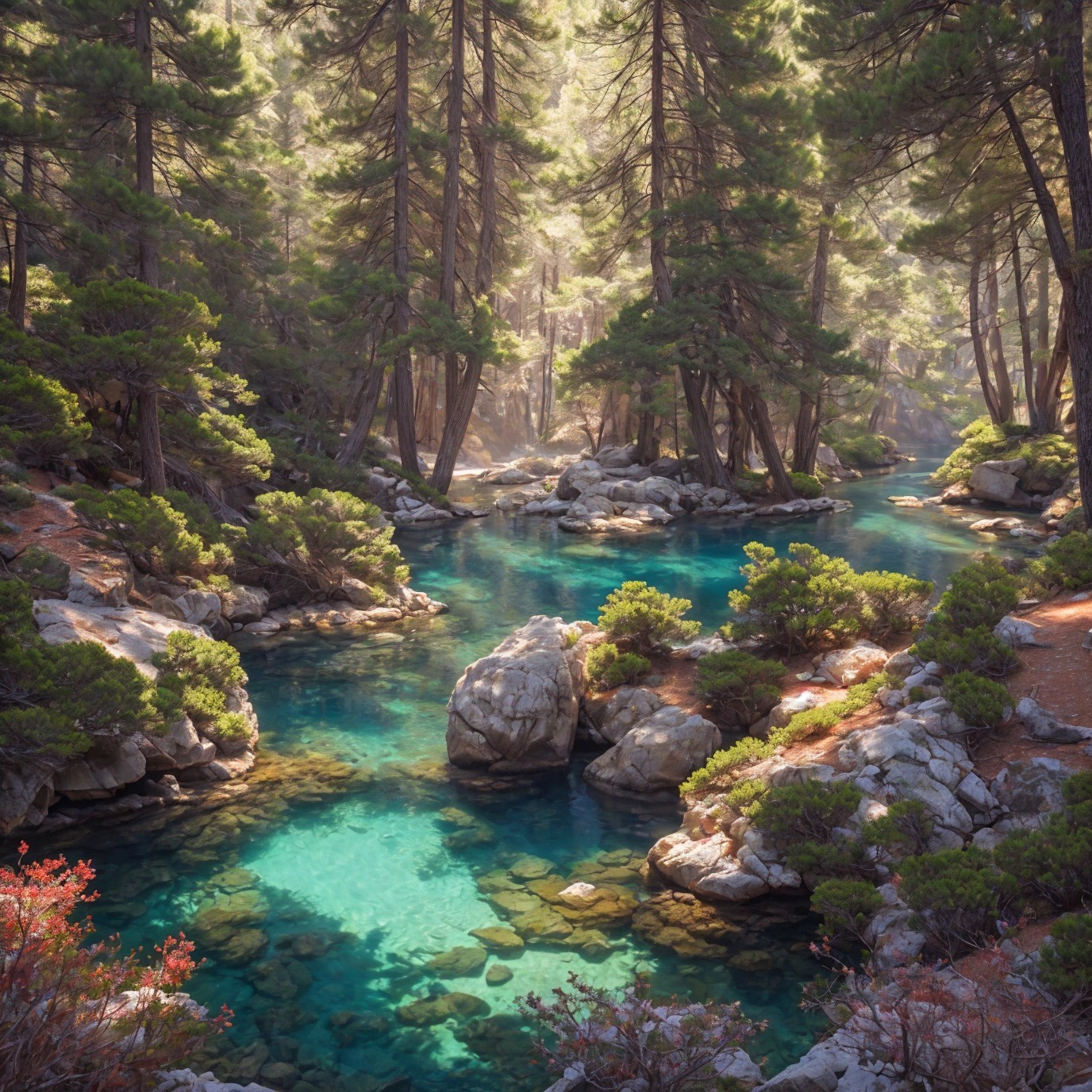 A serene forest creek with crystal-clear turquoise water, surrounded by lush pine trees and sunlit, rocky banks.