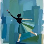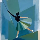 A stylized figure of a dancer, dressed in a black top and a flowing green skirt, gracefully poses while holding a spear. The backdrop features abstract geometric shapes in soft hues.