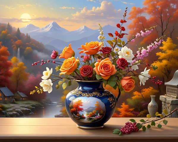 A serene scene featuring a glass bottle with a magnolia flower inside, surrounded by blooming magnolia branches. Soft sunlight illuminates a picturesque landscape in the background.