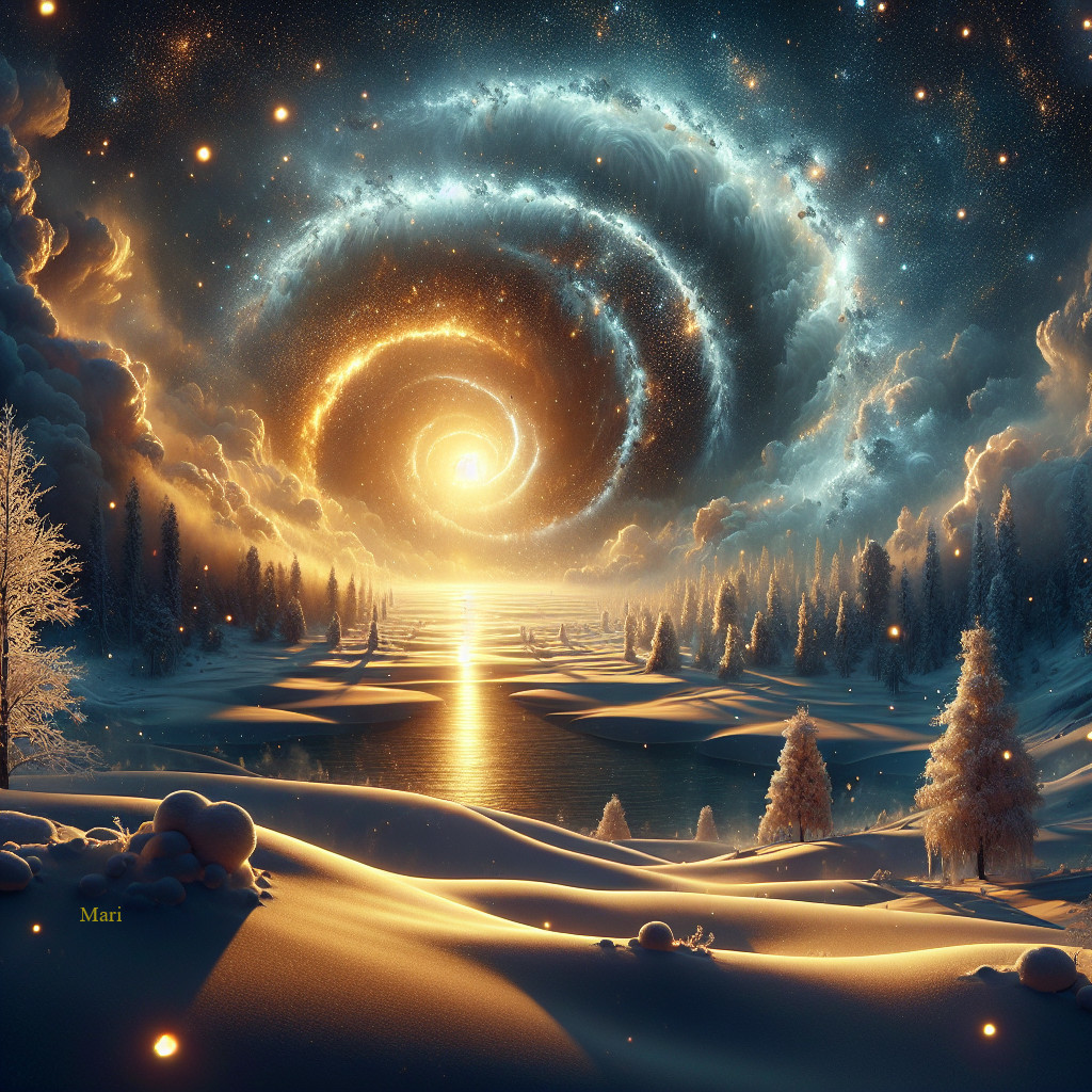 A serene winter landscape unfolds, blanketed in snow. The scene is enhanced by warm glowing lights and scattered stardust, creating an ultra-realistic and enchanting atmosphere of elegance and beauty.