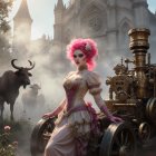 A woman in a vibrant pink gown poses beside a steampunk vehicle, set against an ornate, misty backdrop of flowers and intricate architecture. The scene exudes a whimsical, vintage vibe.