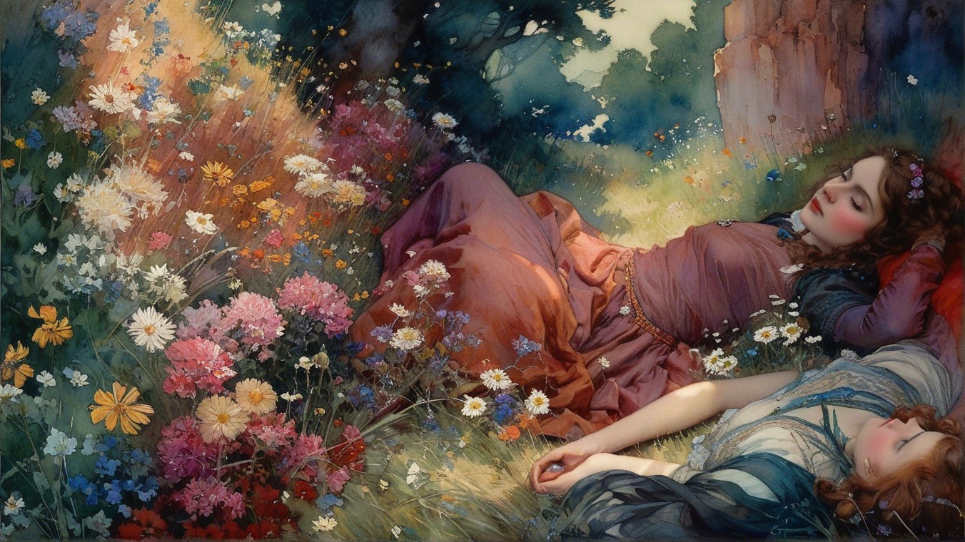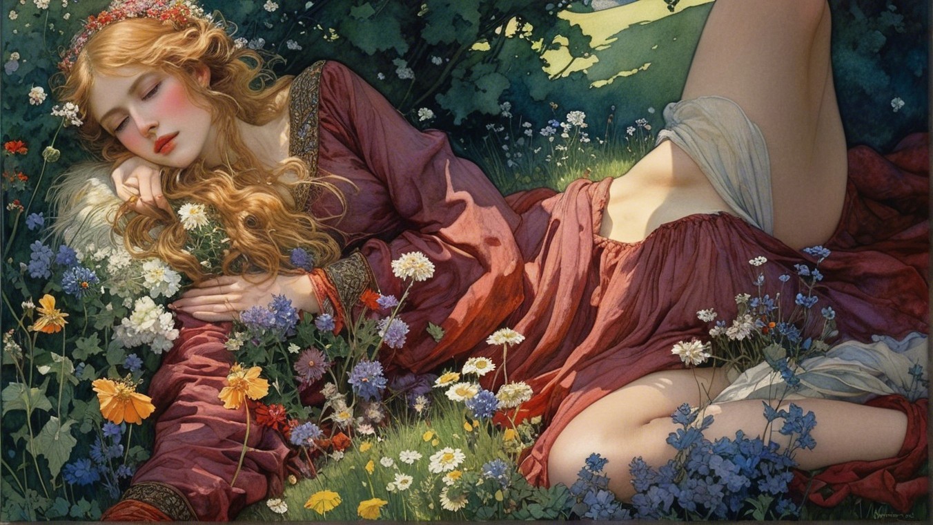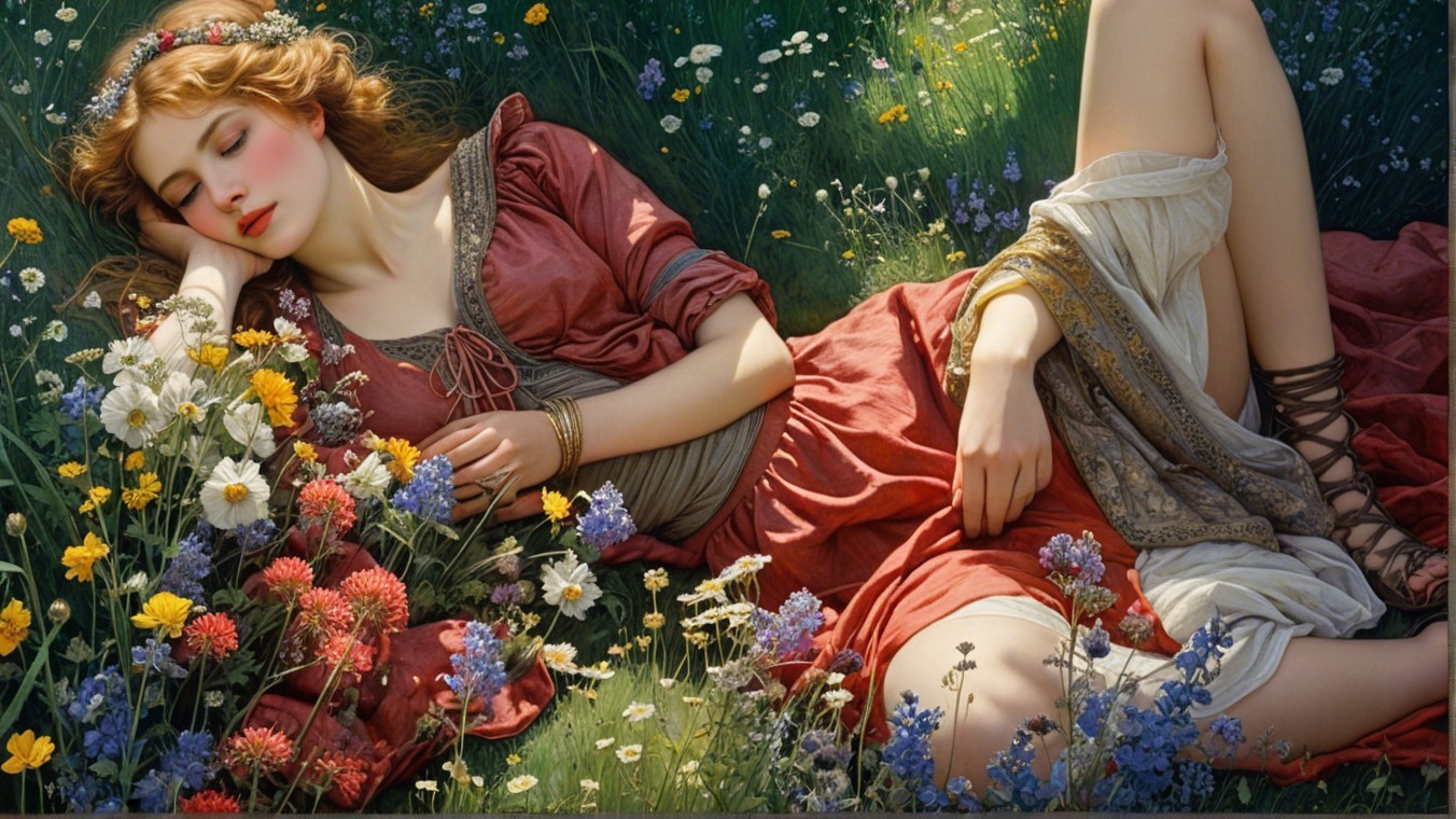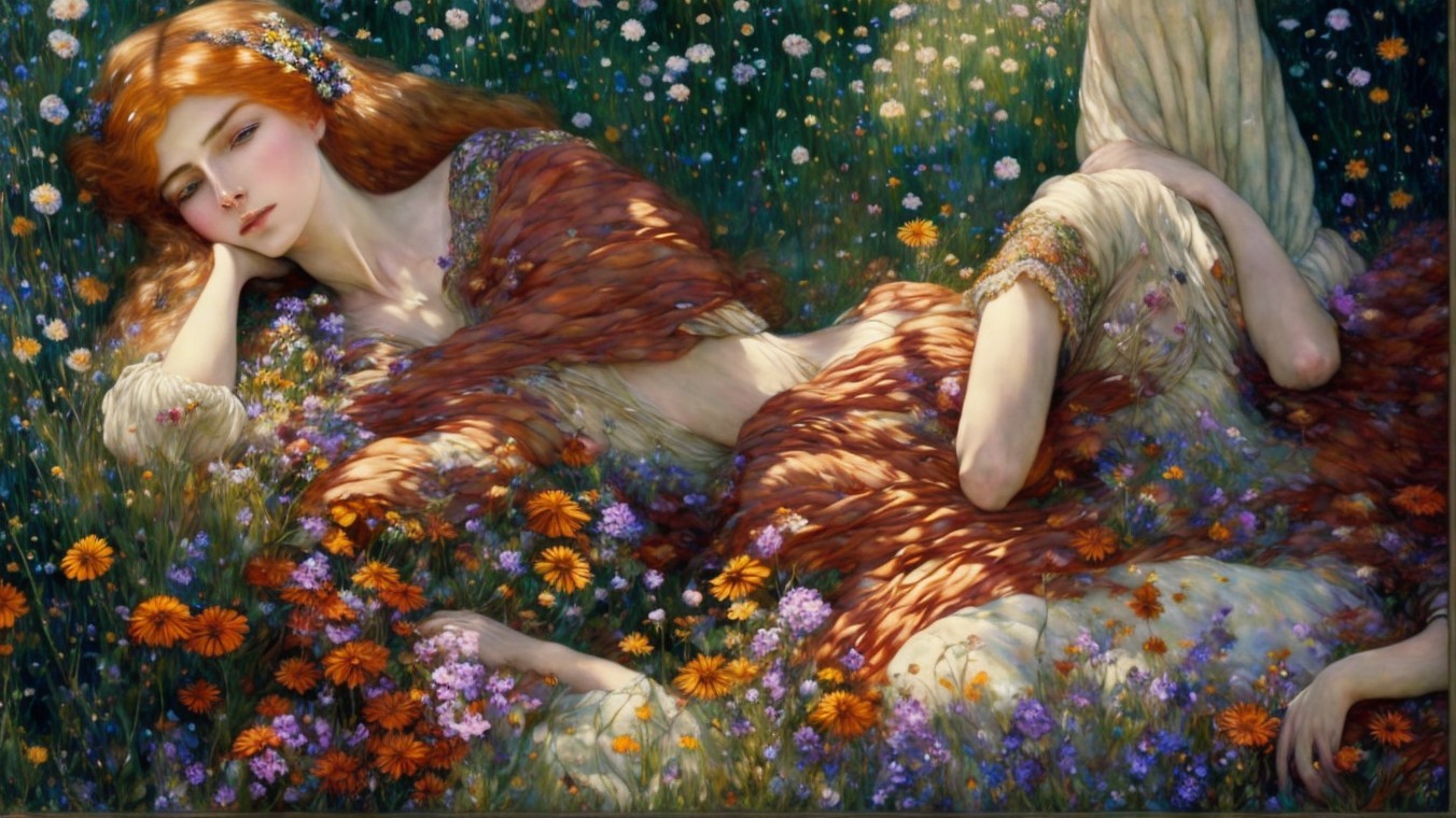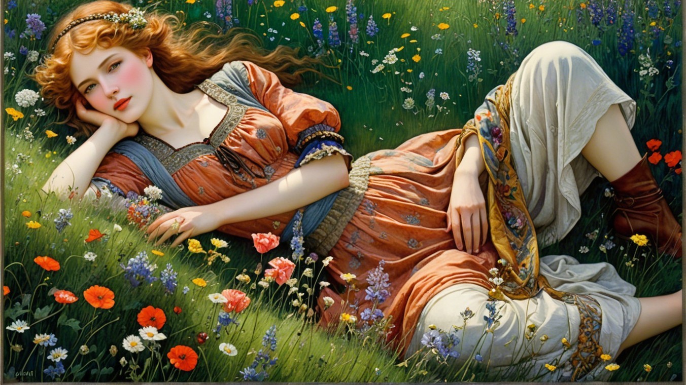 A young woman in a flowing orange dress lies on soft grass, surrounded by colorful wildflowers. Her serene expression and relaxed pose convey a sense of peace in a beautiful natural setting.