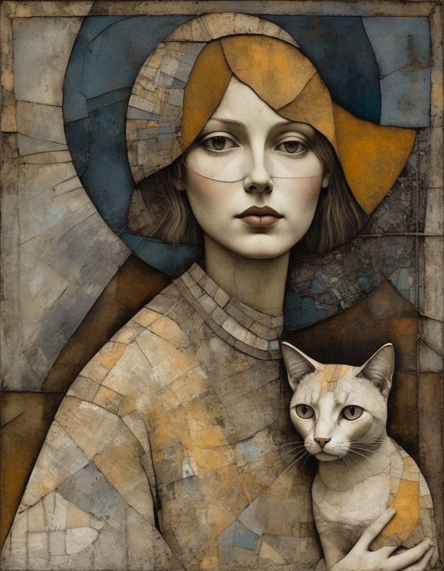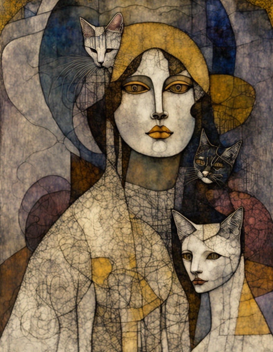 A painting of a woman with geometric patterns on her attire and headscarf, accompanied by a cat, against an abstract background.