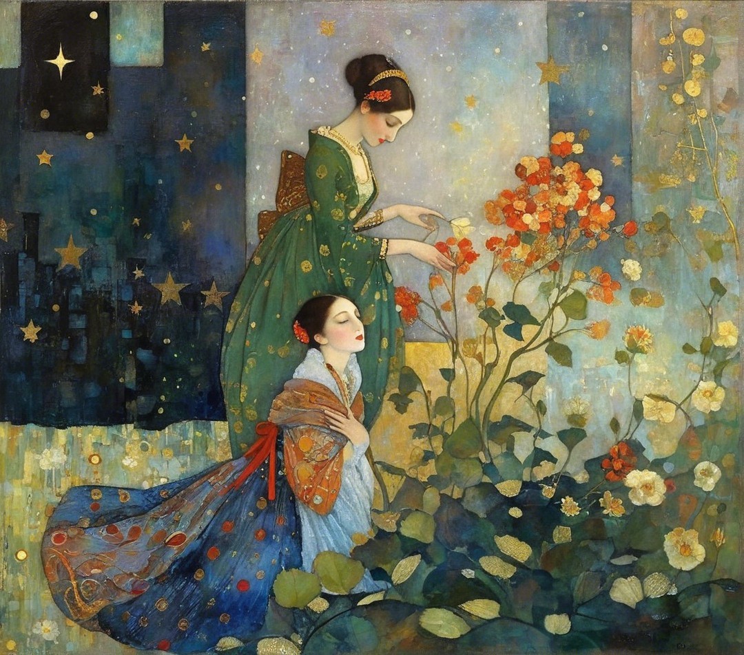 The artwork features two elegant women in flowing dresses, standing near a blooming flower bush. A serene moonlit landscape provides a tranquil backdrop, enhancing the ethereal atmosphere.