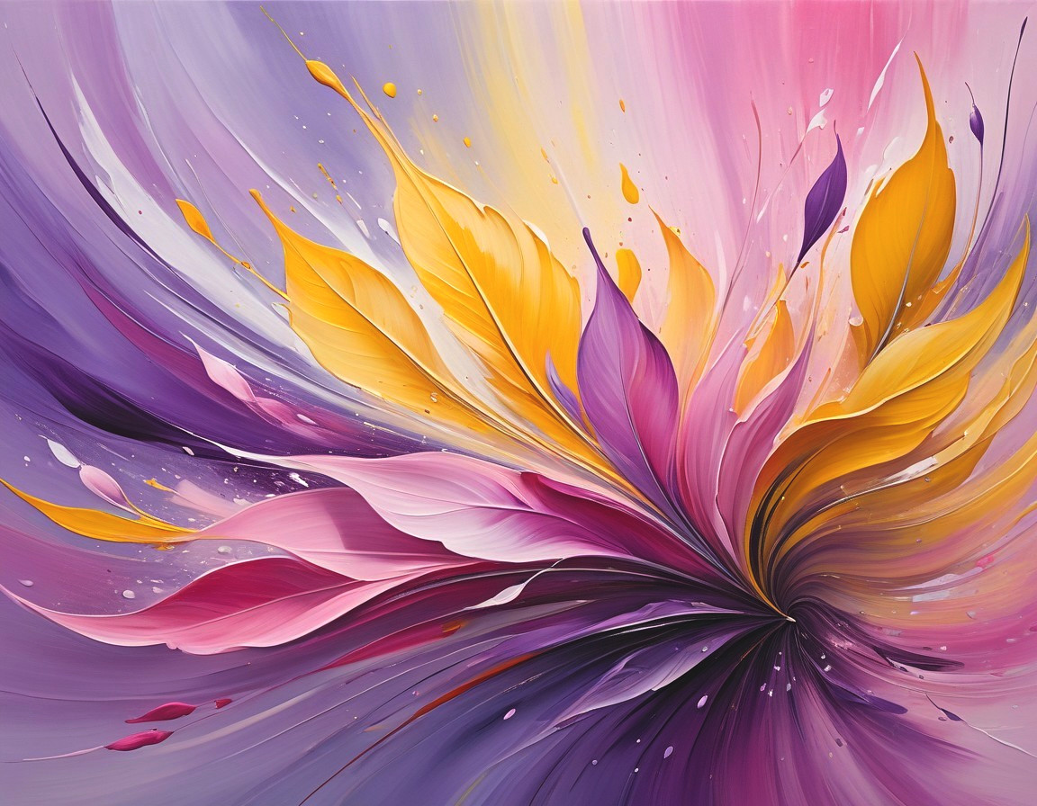 A vibrant swirl of colors featuring bold yellow, soft pink, and deep purple, creating a dynamic floral-like explosion. The brush strokes convey movement and energy amidst a soothing background.