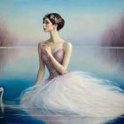 A graceful ballerina in a sparkling, pastel gown stands in tranquil water, with soft pink trees in the background. A serene swan glides nearby, enhancing the enchanting atmosphere.