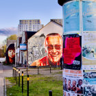 The image features a vibrant street art mural of a charismatic man in sunglasses against a colorful city skyline backdrop. Surrounding walls are adorned with various posters and graffiti.