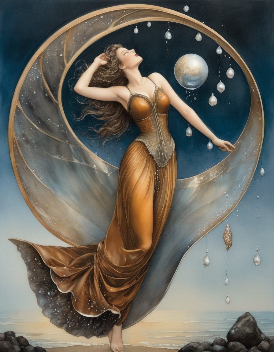A woman in an elegant flowing dress stands within a circular frame, surrounded by seashells and water droplets, evoking a sea goddess vibe.