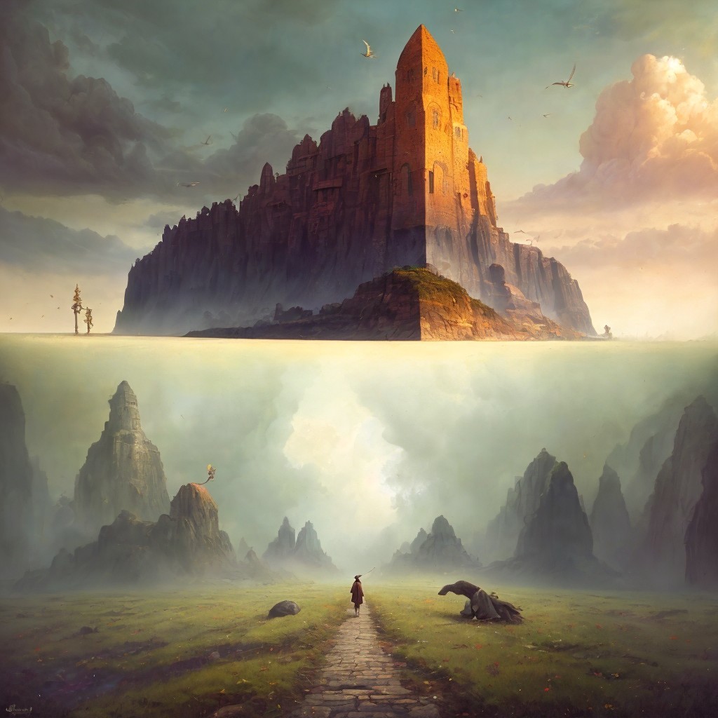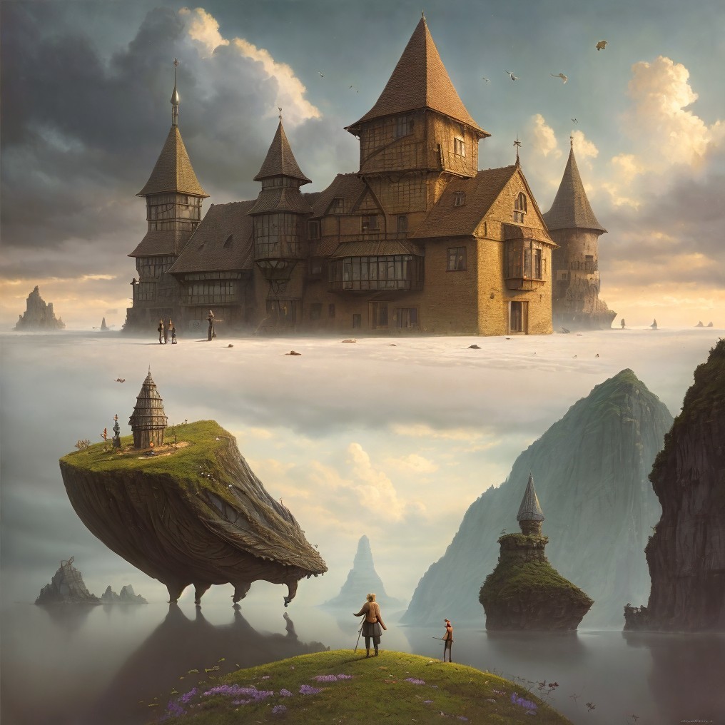 Two fantasy landscapes: The top shows a grand whimsical building on stilts, with people strolling by. The bottom features a house atop a mushroom-shaped rock in a serene lake.