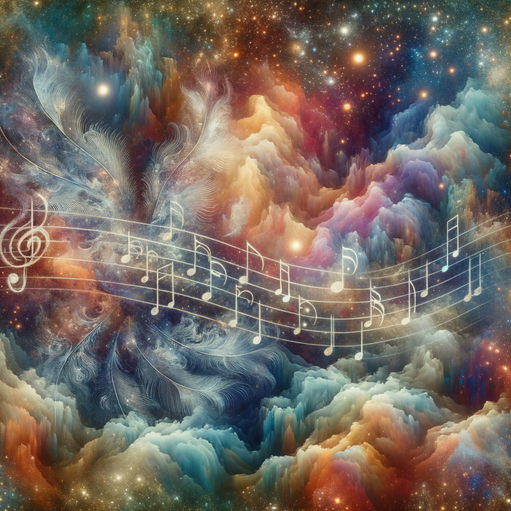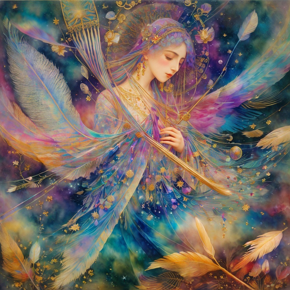 A mystical figure adorned in vibrant, flowing attire with intricate details and feathers. She holds a sun motif, exuding a dreamy aura against a cosmic background of colors and stars.