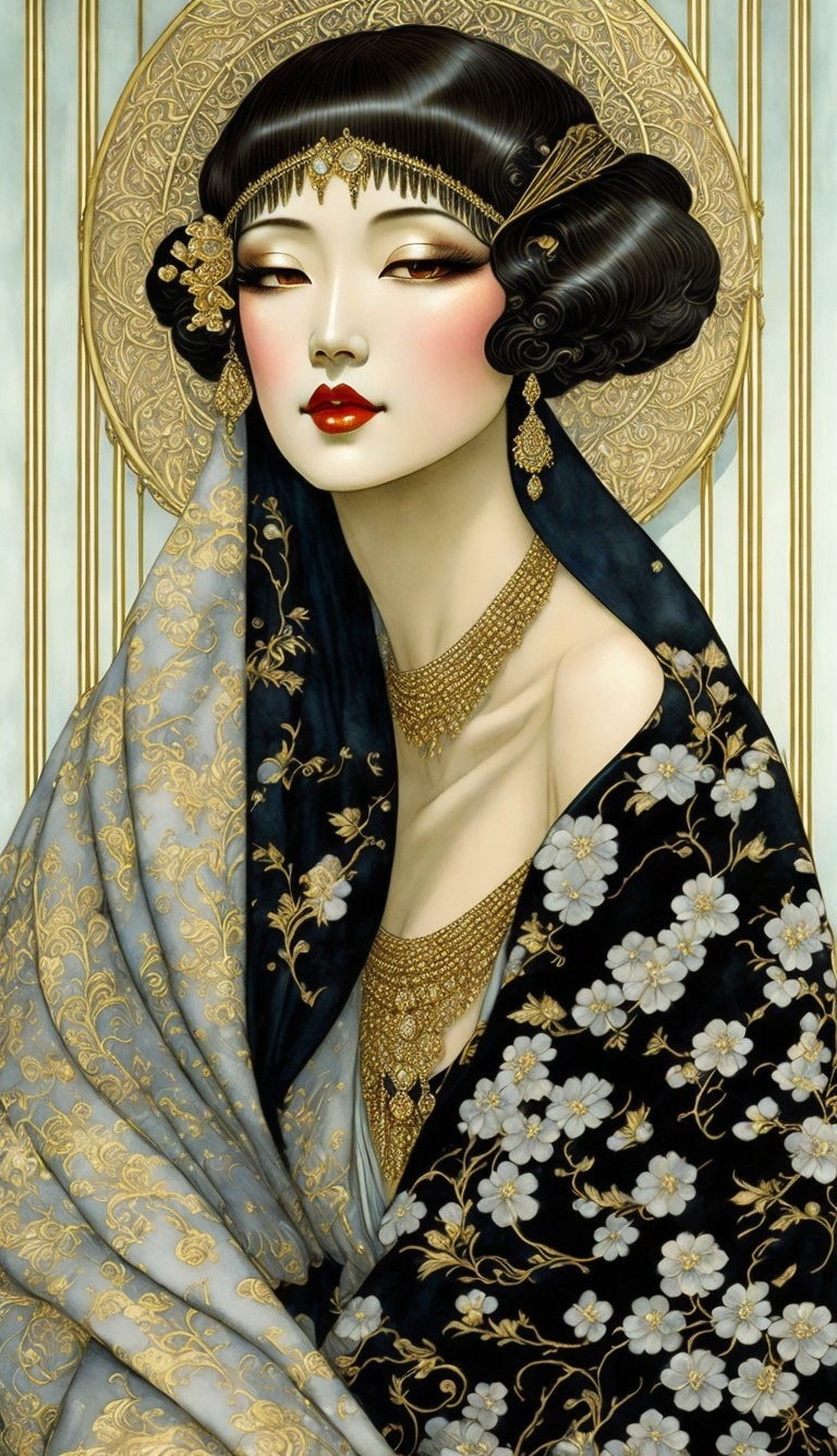 The image features an elegant woman with long black hair styled in traditional fashion. She wears a richly detailed black and gray outfit adorned with flowers, complemented by intricate jewelry.