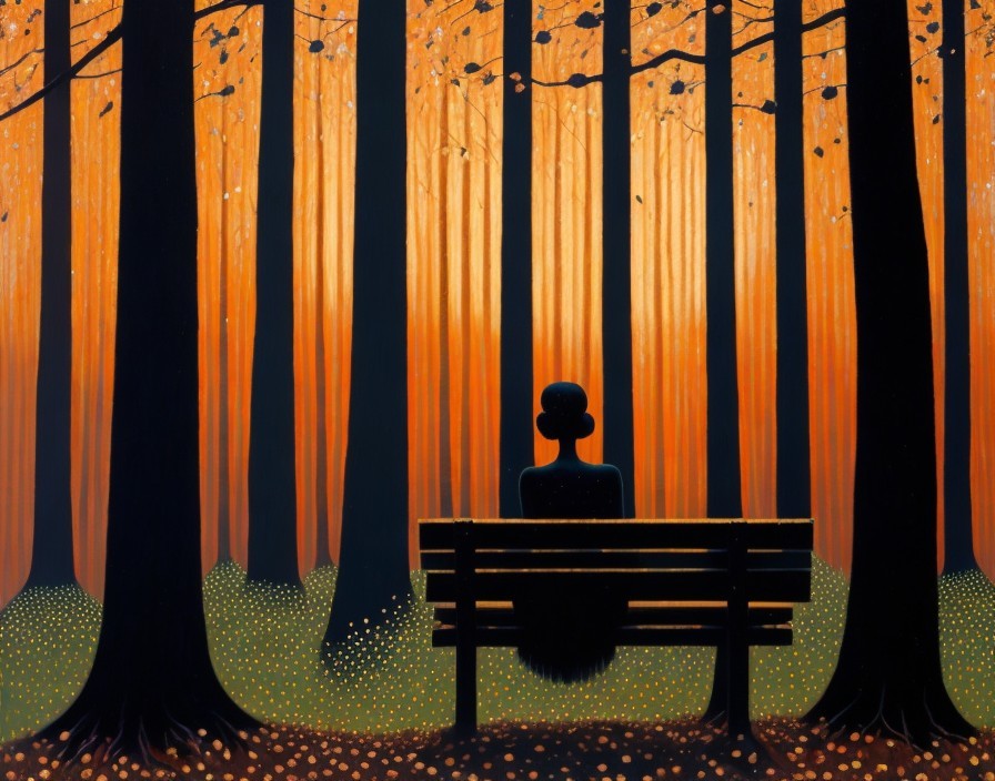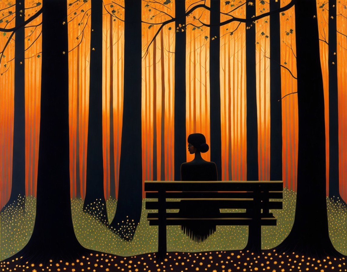 Prompt: Mythical woman seated on an old wooden bench, Horace Pippin style, evoking a sense of mystery, enigmatic gaze fixed in the distance, surrounded by a backdrop of dense, primeval forest with hidden depths, contrasts of dark shadows and specks of light filtering through the canopy, oil on canvas texture, rich earthy tones dominate the palette, subtle hints of vibrant colors on her attire suggesting otherworldliness, highly detailed, with a touch of folklore essence, painterly.