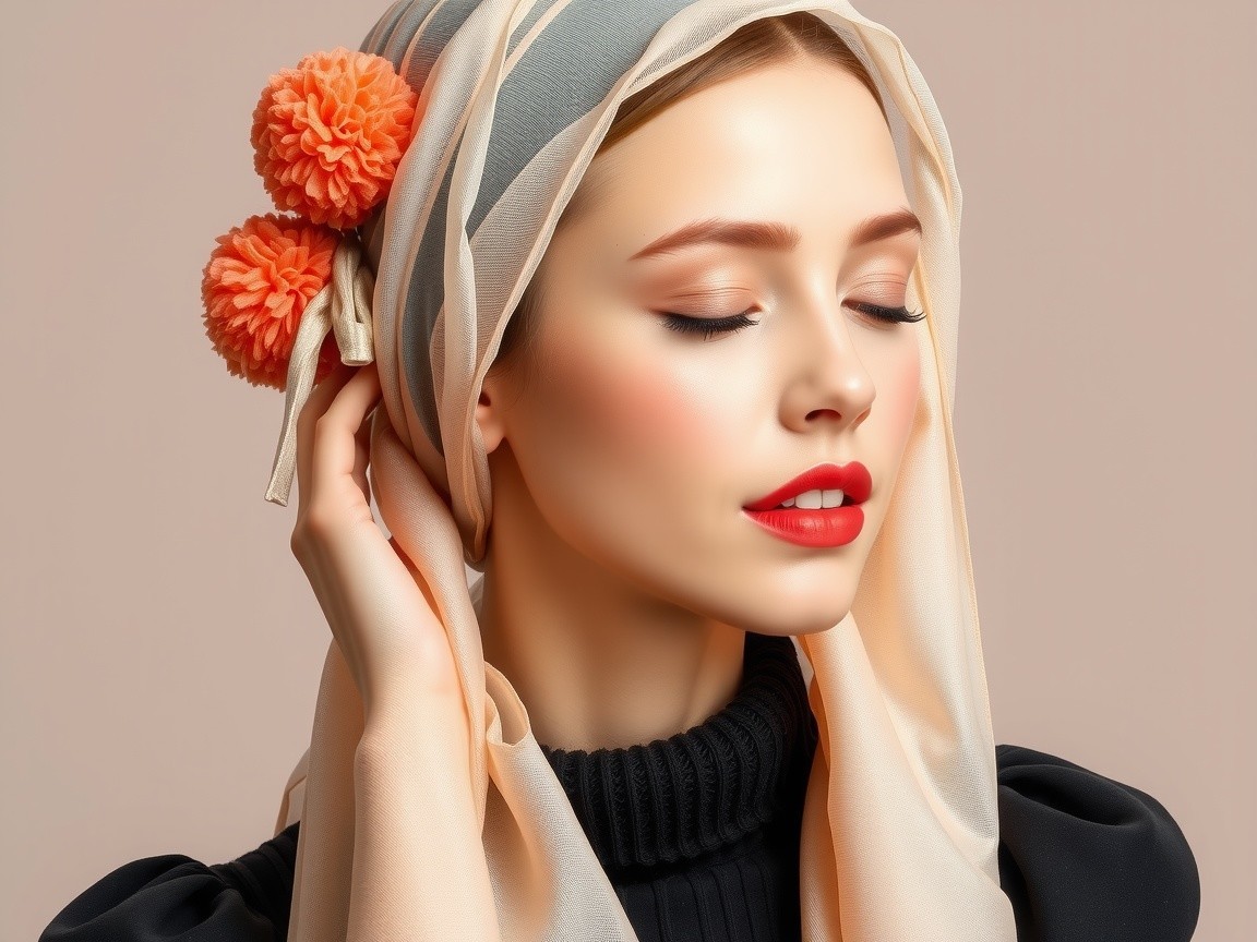 A serene young woman with closed eyes embodies tranquility. Her fair skin and delicate features contrast with vibrant coral lips. Dressed in a textured dark garment and a stylish headscarf, she exudes calmness against a soft, muted background, inviting peaceful reflection.