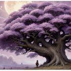 A majestic, ancient tree with vibrant purple blossoms stands against a surreal, colorful sky. A lone figure gazes at the tree, surrounded by dreamlike landscapes and celestial elements.
