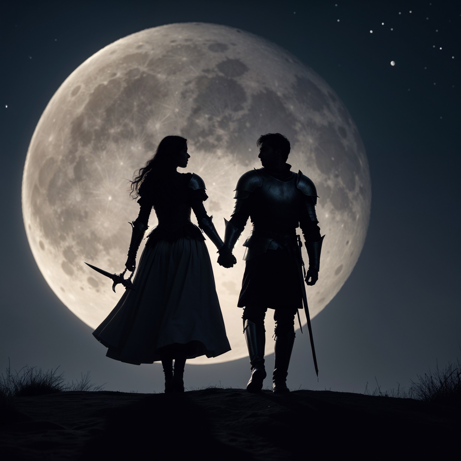 A silhouette of an armored knight and a woman holding hands, framed against a large, bright full moon and a starry night sky, evoking a romantic, fairy tale atmosphere.