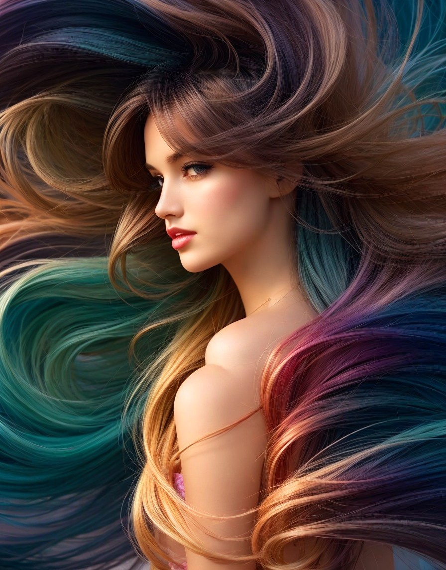 A digital art piece featuring two women with vibrant, flowing hair in shades of blue and blonde, showcasing detailed, transcendent beauty.
