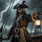 A rugged pirate, dressed in a dark coat and tricorn hat, stands on a ship amidst a storm. He holds a lantern, with lightning illuminating his fierce expression and the turbulent sea behind him.(The base image was created with Raphael app)