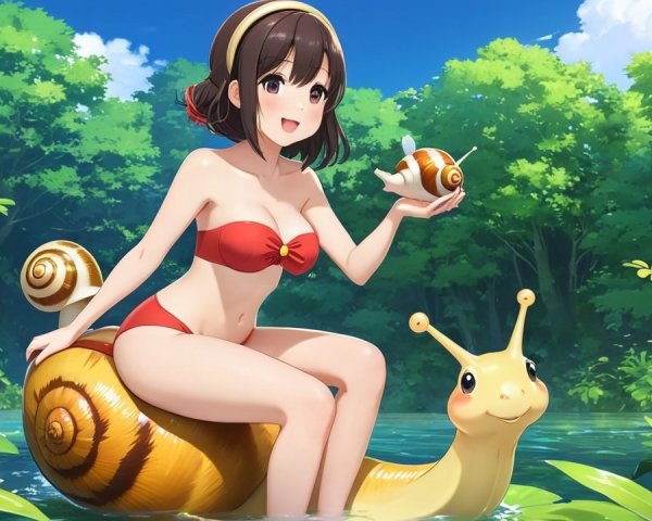 A whimsical scene unfolds as a charming anime goddess gracefully rides a vibrant snail, her flowing hair and ethereal attire contrasting beautifully with the snail's colorful shell, creating a magical atmosphere.