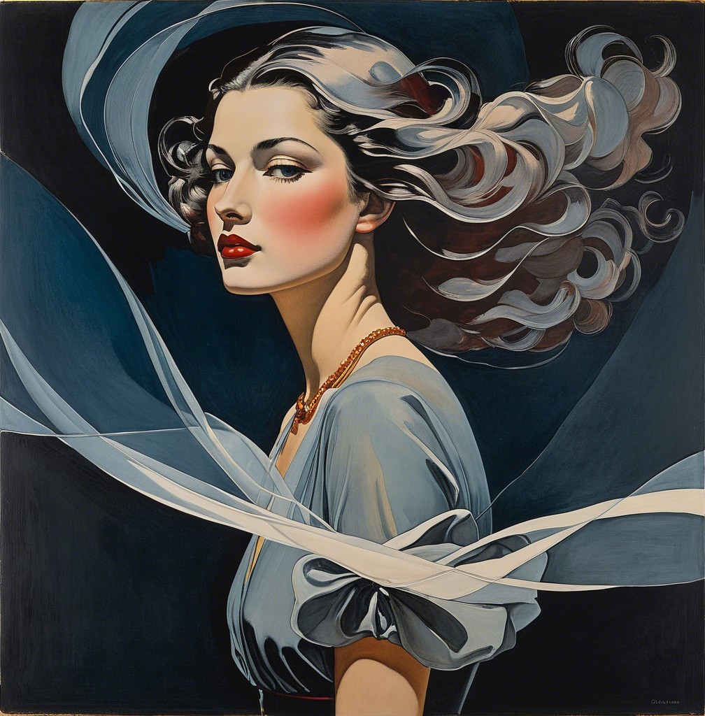 The artwork of Walter Martin Baumhofer and rené gruau is characterized by its whimsical, beautiful, poignant, and touching nature. The color palette often includes shades of rose, gold, rust, burgundy, and black. Artists like Annigoni, Egon Schiele, Milo Manara, Botticelli, Catrin Welz-Stein, Jean Metzinger, and Klimt create soft watercolor pieces with extra water, showcasing an Art Deco style. The attention to detail is evident in the perfect eyes, perfect hands, and highly detailed faces. Complementary colors are used to enhance the overall effect. Watercolor and ink splatters add a dynamic element to the artwork, often set against a dark blue background. Artists like greg rutkowski, loish, rhads, beeple, makoto shinkai, lois van baarle, ilya kuvshinov, rossdraws, tom bagshaw, and alphonse mucha employ techniques like global illumination to create detailed and intricate environments. Other notable artists in this style include Arthur Rackham, Grant Wood, Paul Klee, Lisa Frank, Van Gogh Illustration By Marguerite Delorme, Chokha, Marguerite Zorach, Edward Gorey, and junji ito. The use of gold and silver leaf colors adds a luxurious touch to the artwork