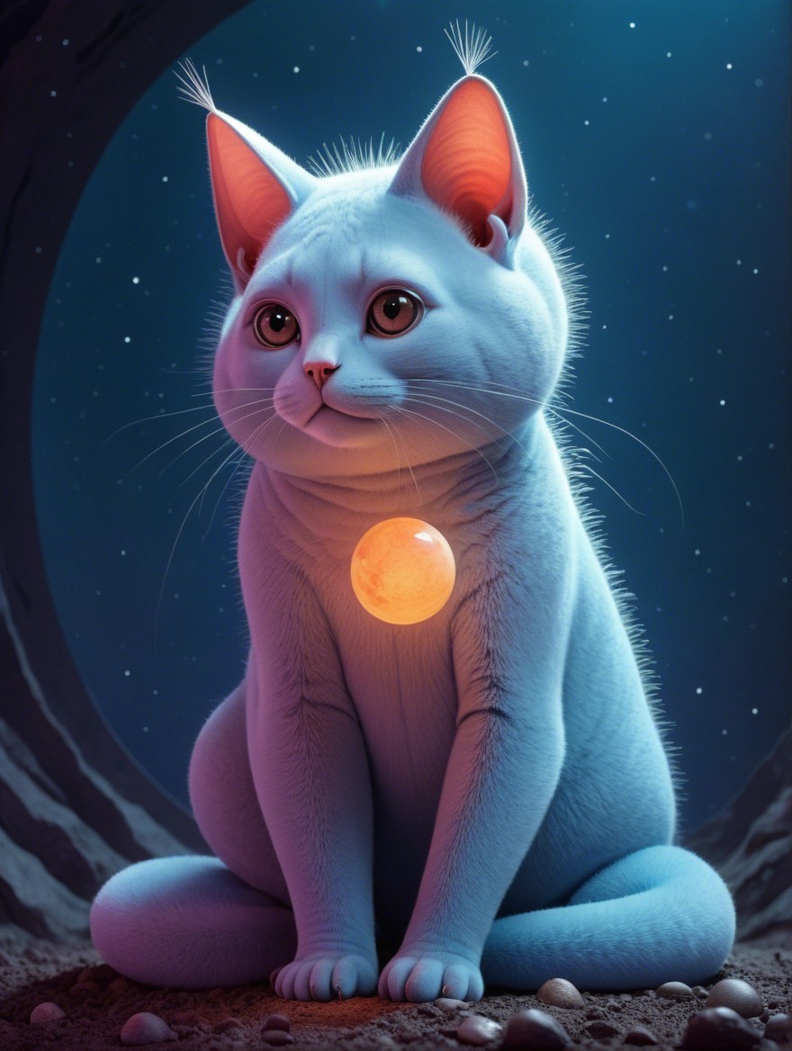 A surreal, blue cat sits in space with a glowing orange planet embedded in its chest. The cosmic background features distant stars and planets, creating a dreamlike atmosphere. Orginal Prompt: Borlip