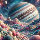 An astronaut stands on a surreal, colorful landscape filled with soft, bubble-like formations. Massive gas giants loom in the sky against a starry backdrop, evoking a dreamlike, otherworldly scene.