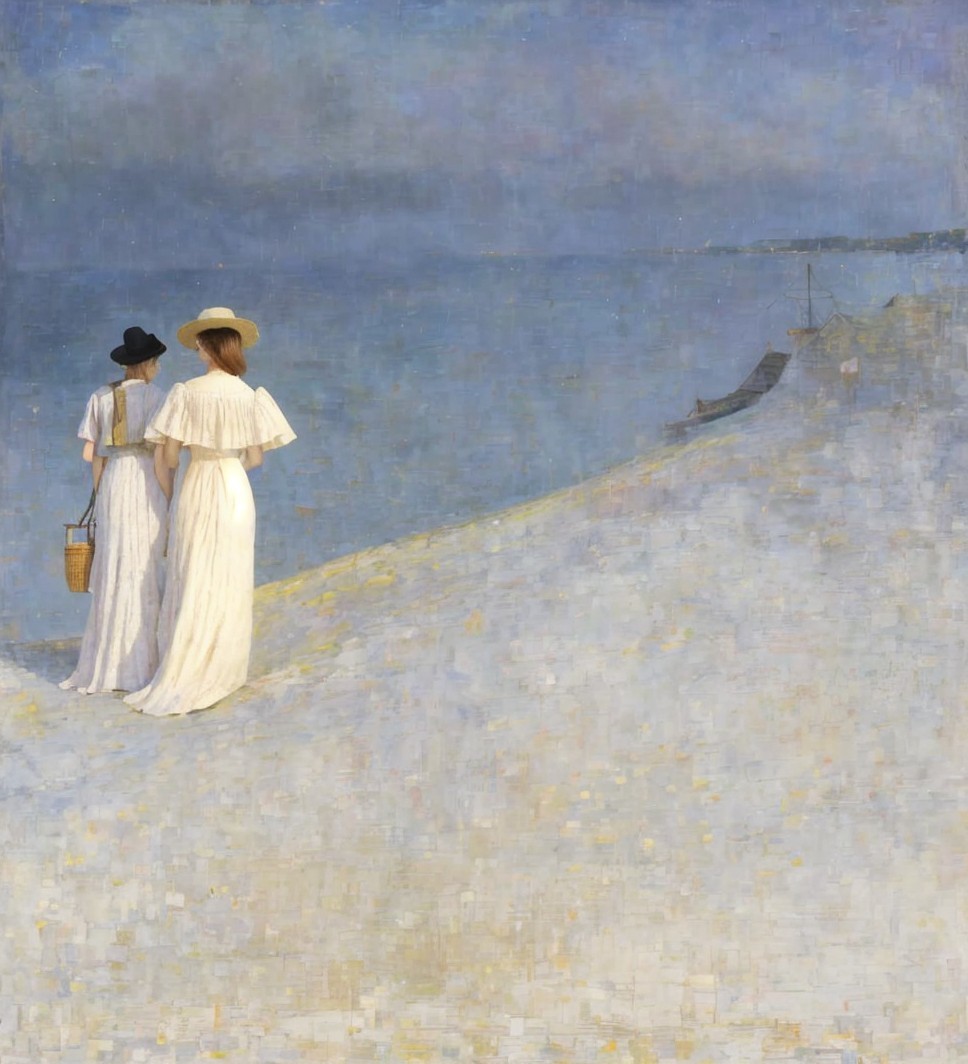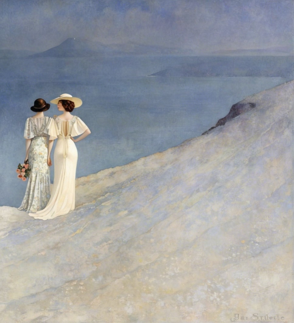 Two elegantly dressed women stand on a balcony overlooking a serene seascape, with gentle waves and a full moon illuminating the sky. The scene is vibrant with soft colors and floral accents.