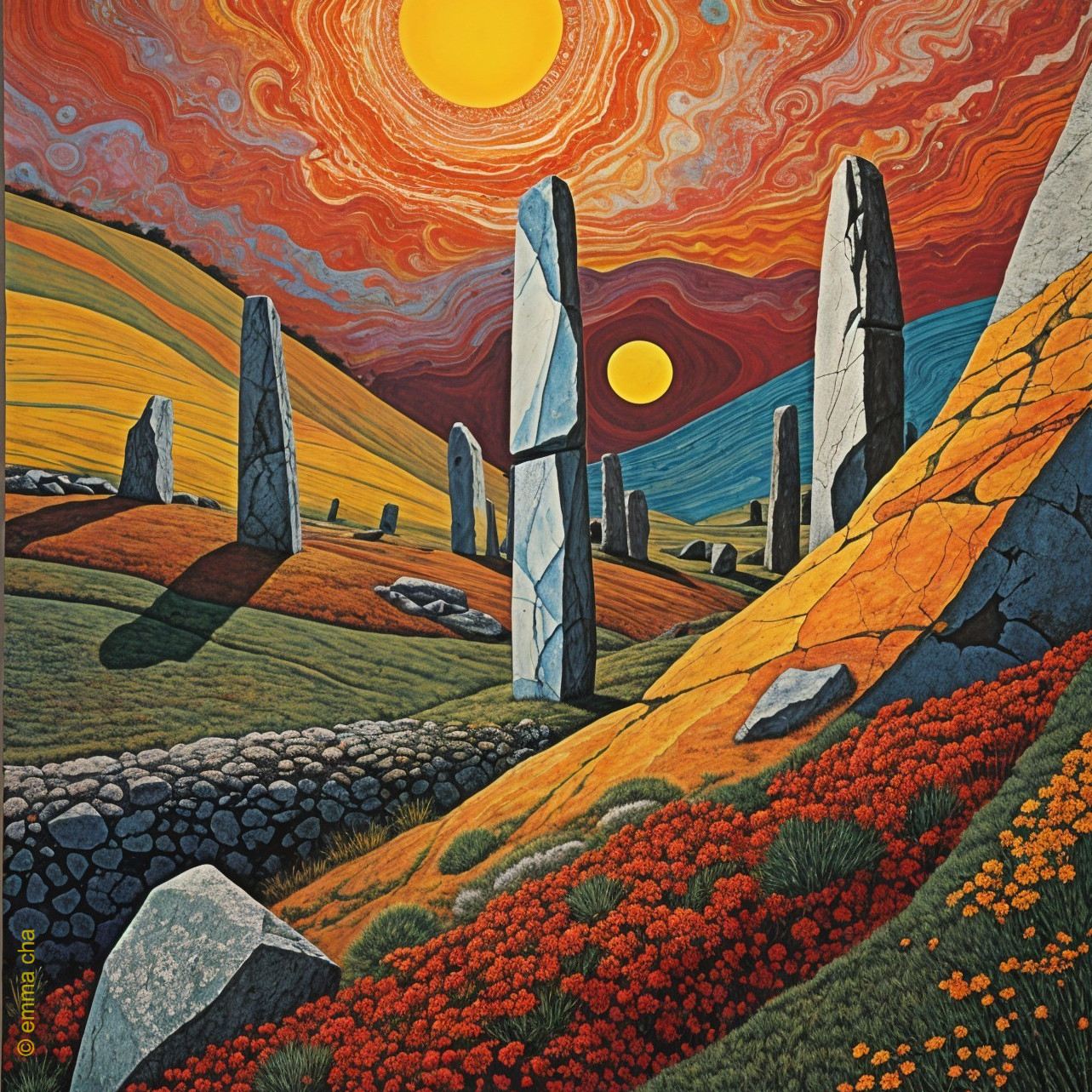 Artistic Statement: "Twin Suns Over the Ancient Stones" merges elements of surrealism and fantasy with hyperrealistic detail. Inspired by the cosmic surrealism of Roger Dean and the psychedelic landscapes of Alex Grey, the artwork presents an alternate world where ancient standing stones are bathed in the glow of twin suns. The vivid colors and swirling sky evoke a sense of awe and wonder, juxtaposing the serenity of nature with the fantastical.